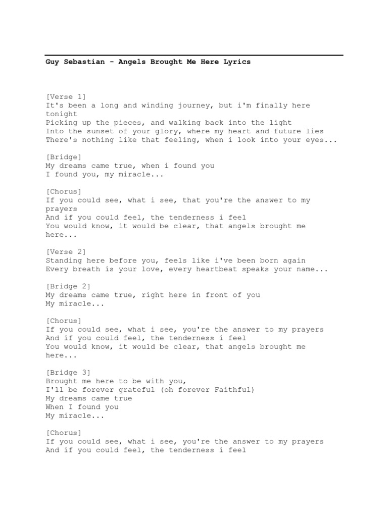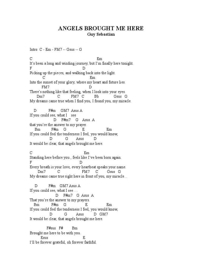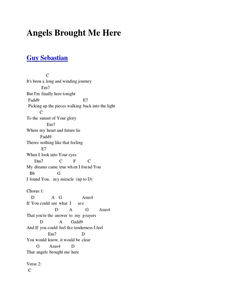 Guy sebastian angels brought me here chord. C Its been a long and winding journey Em7 But Im finally here tonight Fadd9 Dm Picking up the pieces walking back into the light C To the sunset of Your glory Em7 Where my heart and future lie Fadd9 Theres nothing like that feeling Dm When I look into Your eyes Dm7 C F C My dreams came true. But Im Em7 finally here tonight. You would know it would be clear that angels brought me here.